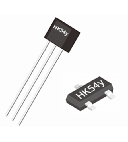 Each sensor in the HK54y series includes a temperature compensated Hall board with active offset compensation, a comparator, and an output driver. These sensors operate as 2-wire devices, utilizing open drain output transistors and current sources as output drivers. The function of the comparator is to compare the actual magnetic flux with a fixed reference value (switch point), causing the output transistor in the 2-wire version of the current source to activate (high current consumption) or deactivate (low current consumption).