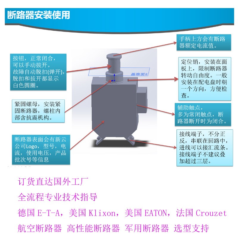 常见的工作电压包括:交流AC115V 400HZ 220V,50Hz,以及380V,50Hz。常用直流包括: DC 28V,,DC32V,DC48V,DC80V,DC110V,以及DC270V。断路器在应用于低于额定电压的情况断路器是可以正常使用的,高于额定电压需要与我们技术人员确认超压的范围以及对断路器的影响。